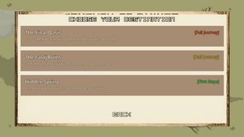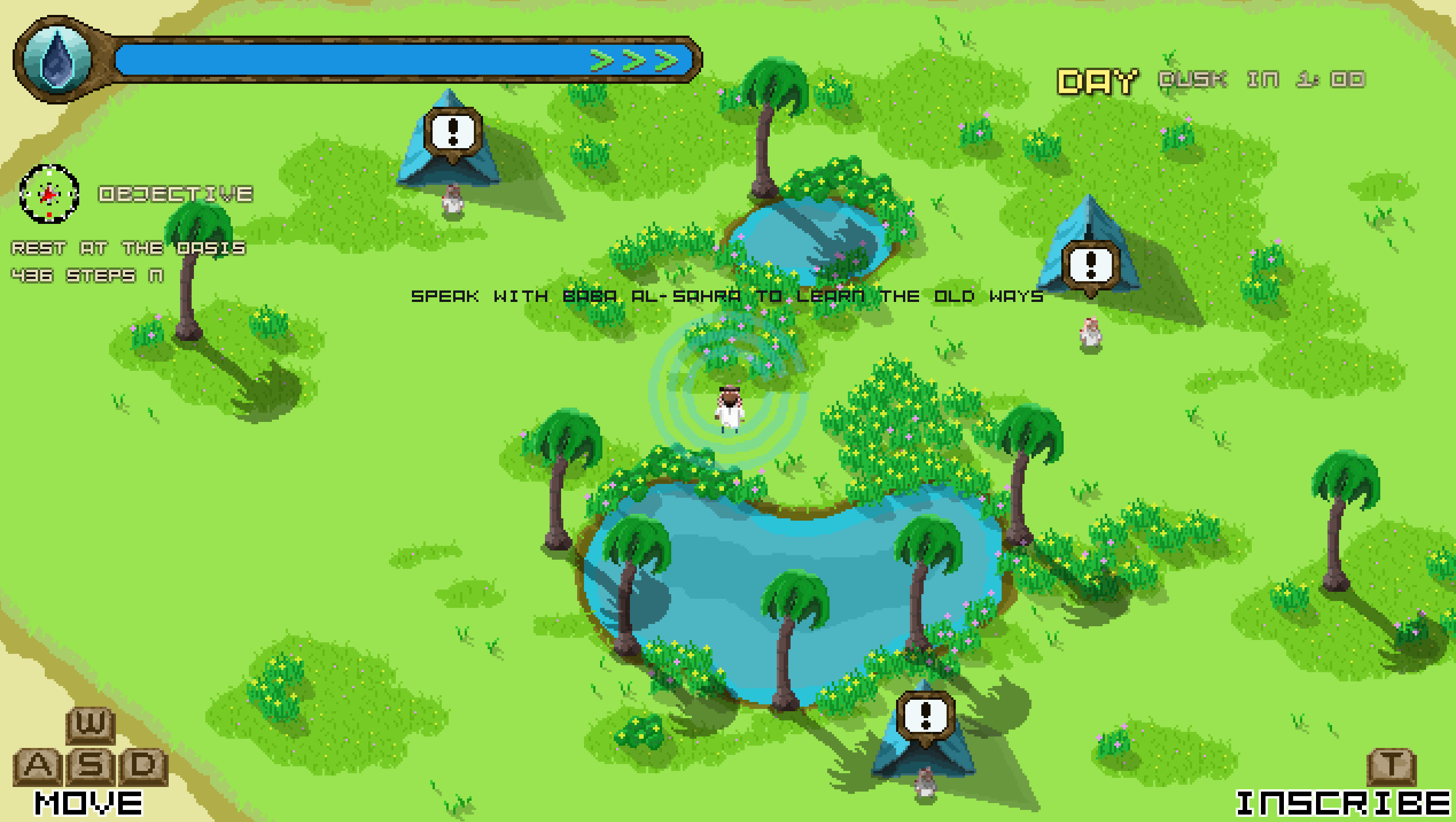 Dhikra is a 2D top-down desert survival journey inspired by Farasat Al-Sahraa the Emirati skill of reading the land with intuition, patience, and responsibility. Water is your lifeline: you travel from oasis to oasis, managing heat, dust storms, and the shifting day/night cycle while scavenging supplies and choosing when to rest or push onward. Using a shovel and dowsing, you interpret subtle signs tracks, sand patterns, shade, and hidden water to uncover safe routes and secret sources. Along the way, you leave inscriptions and encounter traces of other travelers, turning survival into a shared story. Reach the final oasis by making smart navigation, ethical resource choices, and resilient decisions under pressure.